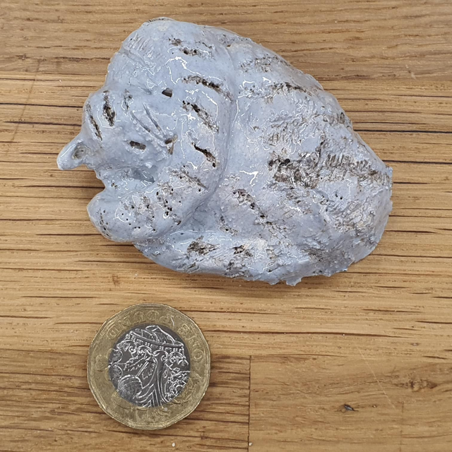 Pieces are modelled in clay, coloured using slips, glazes, stains and oxides and fired twice in a kiln up to 1300'C.