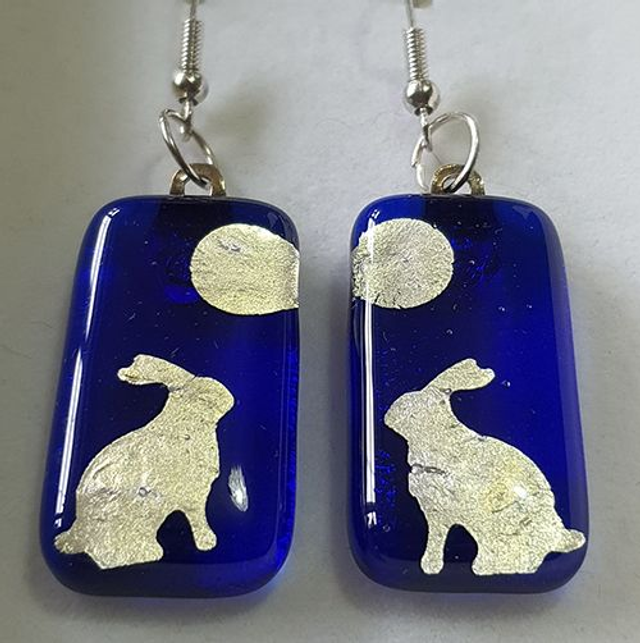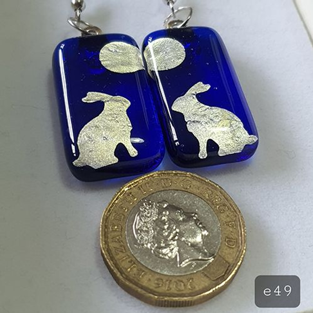 Blue fused glass with silver hare staring at moon design dangly earrings e49