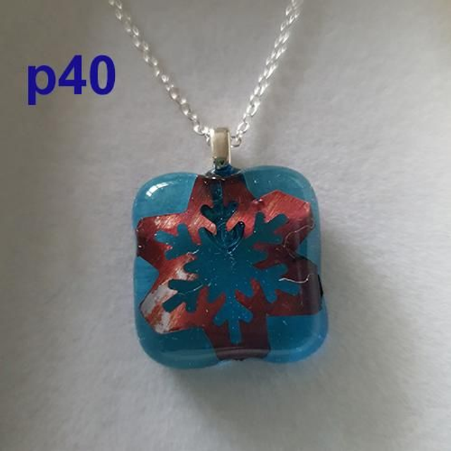 Copper snowflake on blue glass pendant & chain p40