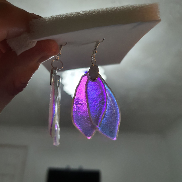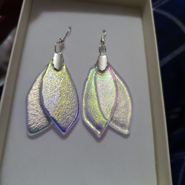 Fused glass earrings made from glass sheets that I fuse together in my kiln at high temperatures (between 800-900⁰C.)