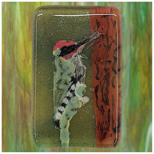Photo of a glass enamel badge. Enamel is moved about with a pin to 'paint' birds before being fired in my kiln.