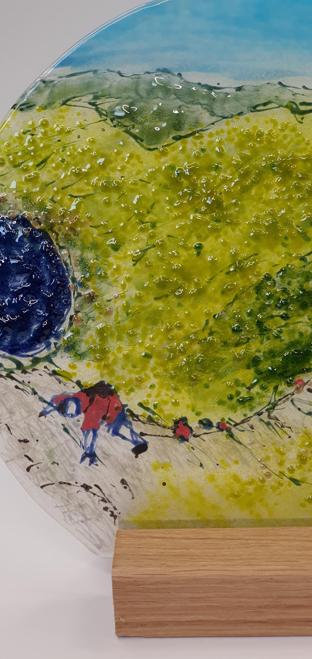 Created from gritted or powdered glass and enamels and fired up to 900'C in my kiln between 2 and 4 times building up texture and colours in layers.