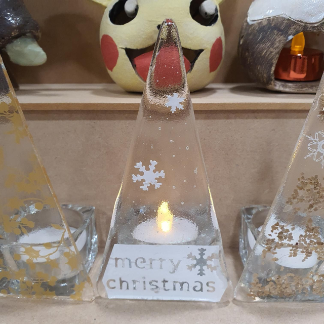 Glass tealight holders in form of a Christmas tree.
