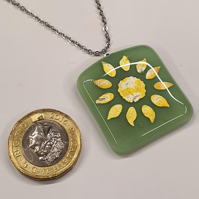 Fused glass pendant made from glass sheets that I fuse together in my kiln at high temperatures (between 800-900⁰C.)