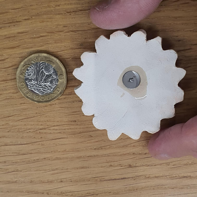 Ceramic pin badge with butterfly pin clutch.