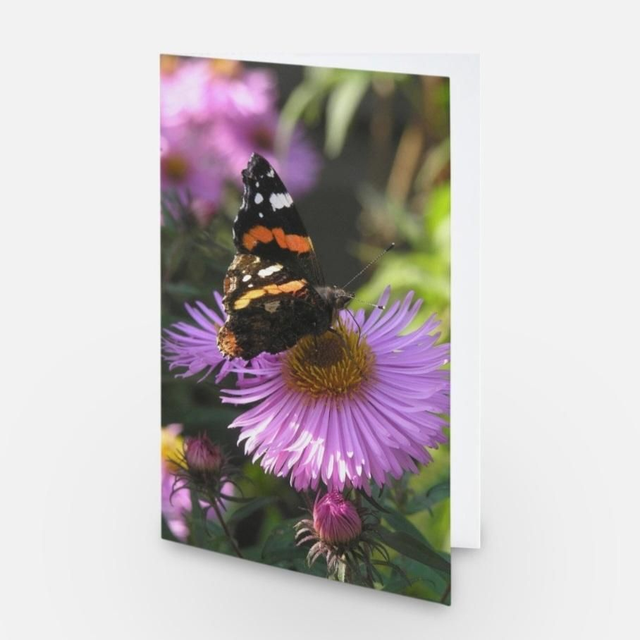 Red admiral butterfly on aster / chrysanthemum flower greeting card