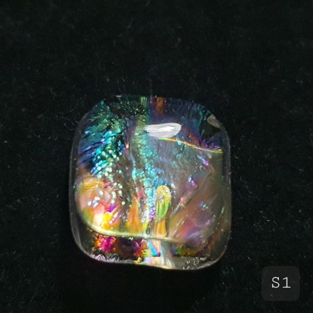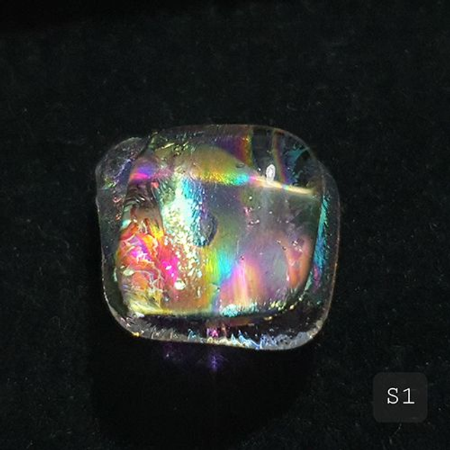 Rainbow coloured glass squares that change colour in different lights and when viewed from different angles.