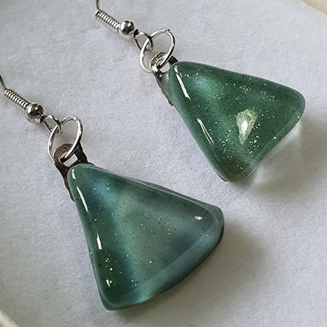 Sparkly green xmas tree shaped dangly fused glass earrings e66