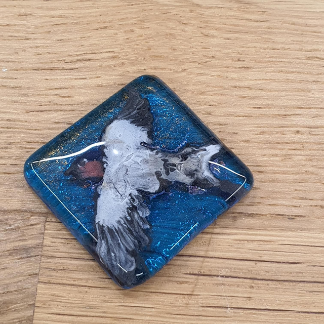 Fused glass badge made from glass sheets that I fuse together in my kiln at high temperatures (between 800-900⁰C.)
