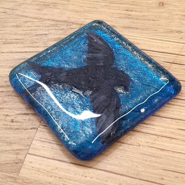 Fused glass badge made from glass sheets that I fuse together in my kiln at high temperatures (between 800-900⁰C.)