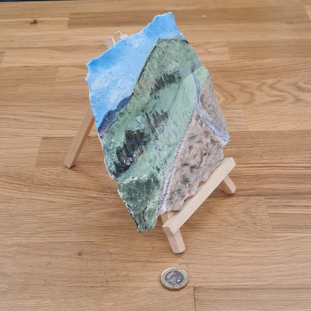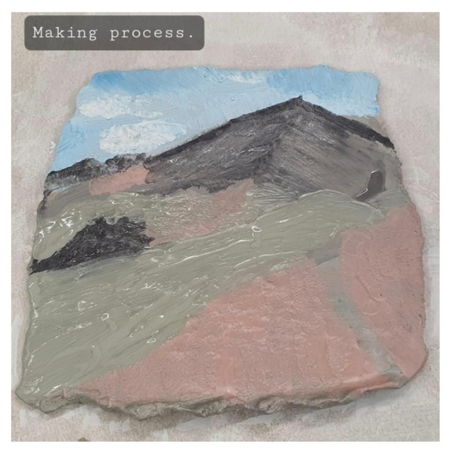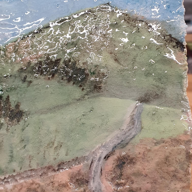 Piece is built up in layers using slips and oxides applied in a painterly way. Piece es are often textured i.e. not flat.