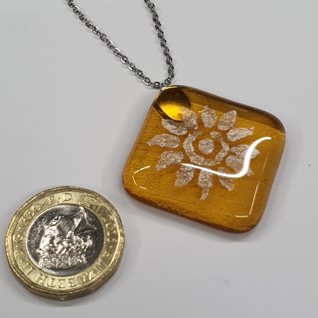 Fused glass pendant made from glass sheets that I fuse together in my kiln at high temperatures (between 800-900⁰C.)